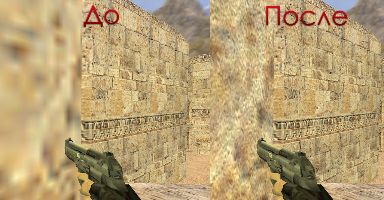 По многочисленным просьбам публикуем для Вас детализированные текстуры для CS 1.6, которые немного улучшат текстуры на некоторых картах в CS 1.6. Текстуры станут более зернистыми и приятными на внешний вид. Стоит отметить, что текстуры останутся стандартными, но у них появится более четкая прорисовка. Для того, чтобы текстуры работали, необходимо будет прописать специальную команду в консоли, которая активирует детализированные текстуры. Ниже Вы можете посмотреть пример до и после использования HD текстур в CS 1.6.
